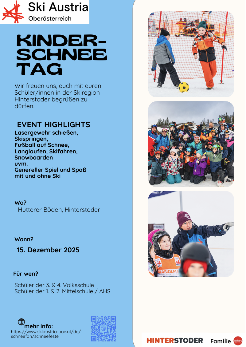 GO FOR SKI - Am 17.12.2025 gibt es auch heuer wieder den OÖ Schulschitag. Für alle Schülerinnen und Schüler gibt es in den genannten Schigebieten (Infoblatt folgt) eine gratis Liftkarte im Rahmen eines Schulschitages. Dies ist eine Aktion des Fachverbandes Seilbahnen (WKÖ), der Fachgruppe Seilbahnen in der Wirtschaftskammer Oberösterreich sowie der teilnehmenden Skigebiete.