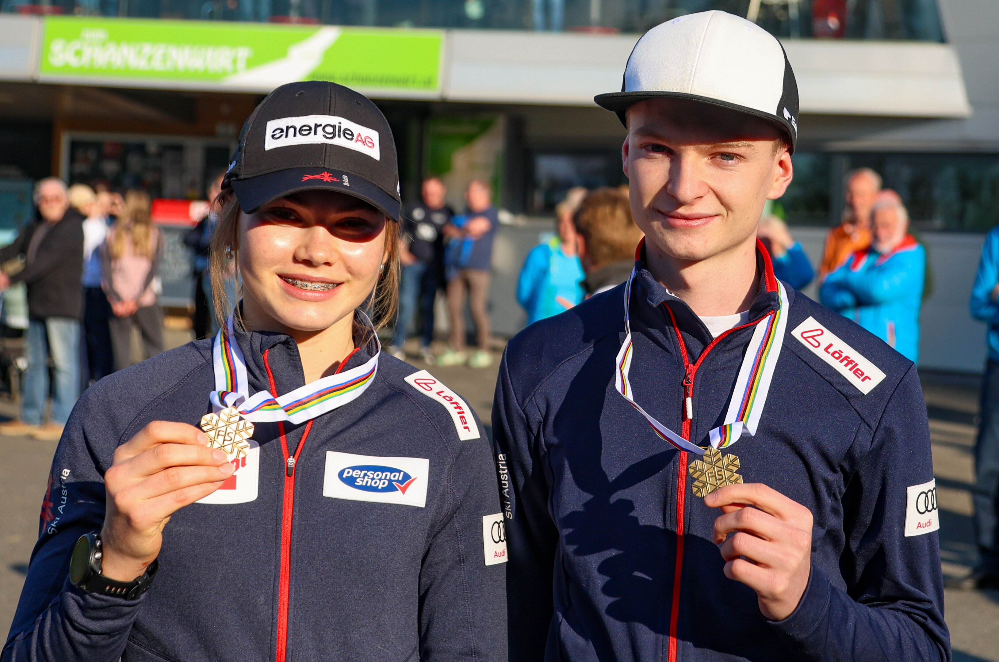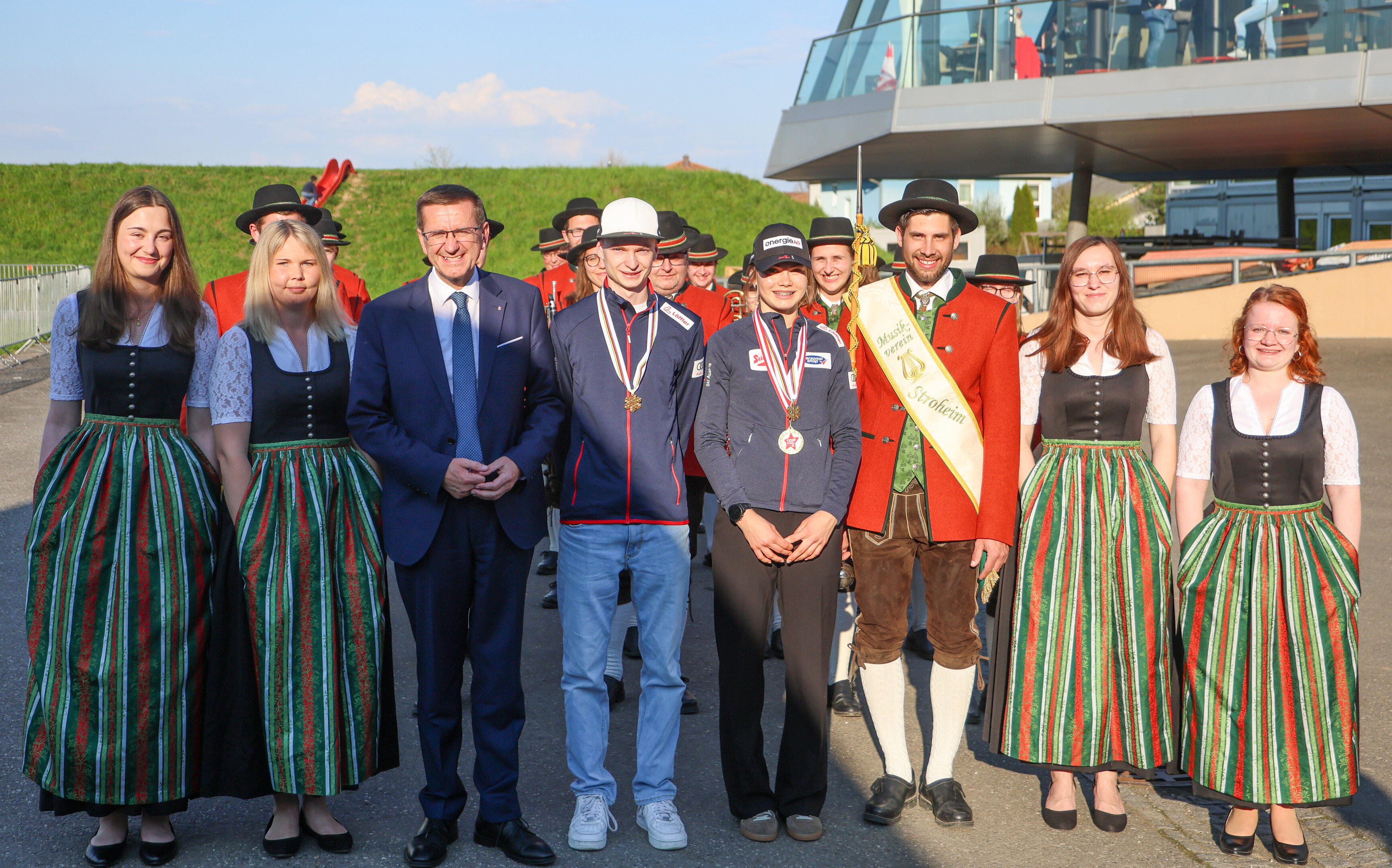 Gleich zwei frisch gebackene Junioren-Weltmeister in den eigenen Reihen waren für den UVB Hinzenbach Grund genug, um für seine jungen Vereinsmitglieder eine Begrüßungsfeier zu organisieren. Gemeinsam mit der Musikkapelle Strohheim und den Springerkindern mit ihren Skiern marschierten die Juniorenweltmeisterin und der Juniorenweltmeister in die Energie AG Arena Hinzenbach ein.