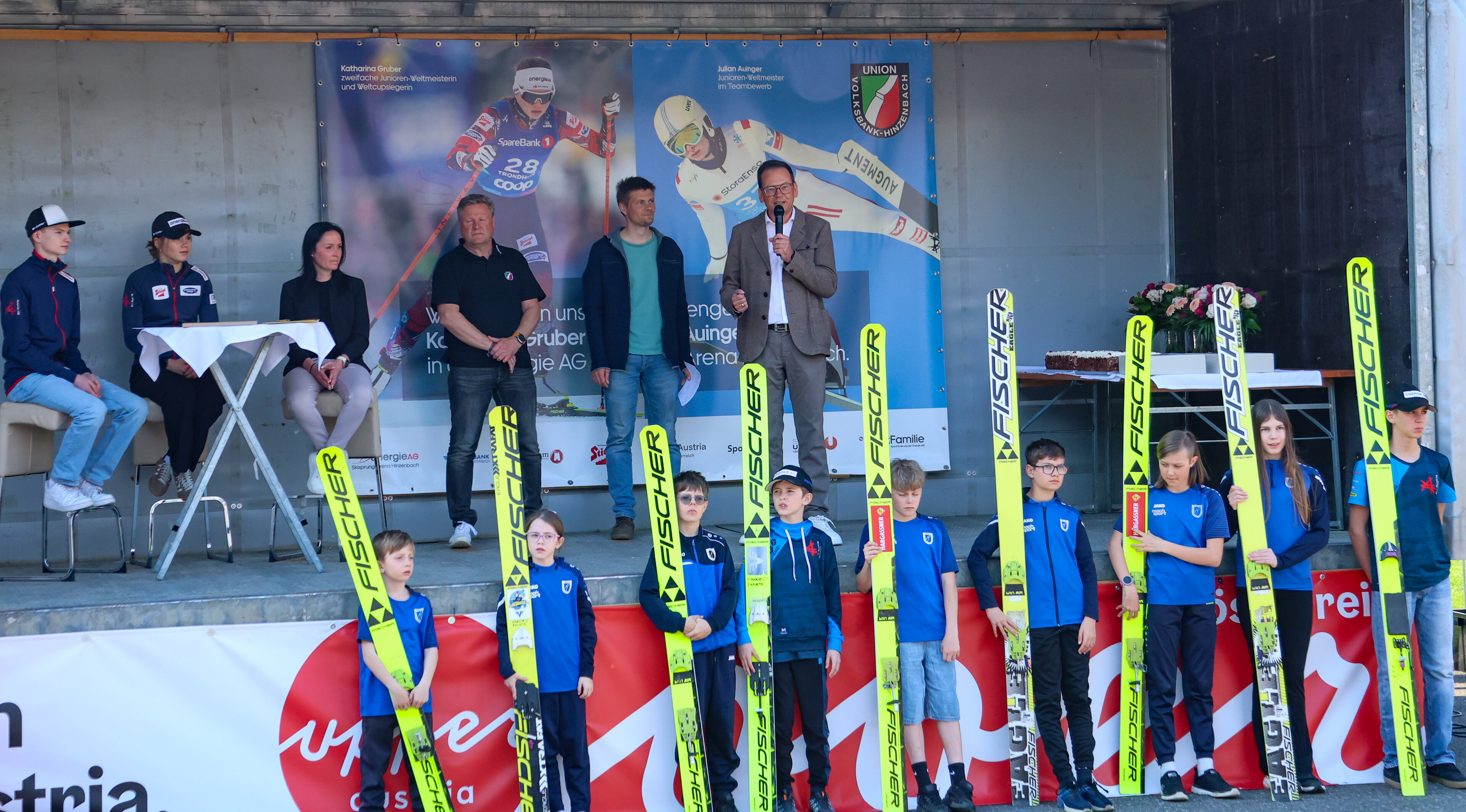 Auf der Bühne beantworteten sie in einer kleinen Talkrunde Fragen und durften sich über Glückwünsche und kleine Präsente freuen. Landesskiverbandspräsident Klaus Kumpfmüller überreichte Gruber und Auinger ein zweites Mal Gold, in Form eines Golddukaten. Vom UVB Hinzenbach gab es eine hübsch verzierte Torte und für ein wenig Zeit zum Entspannen, Reisegutscheine.