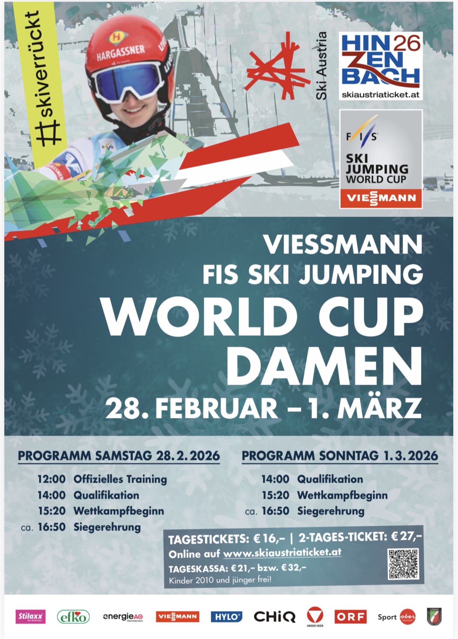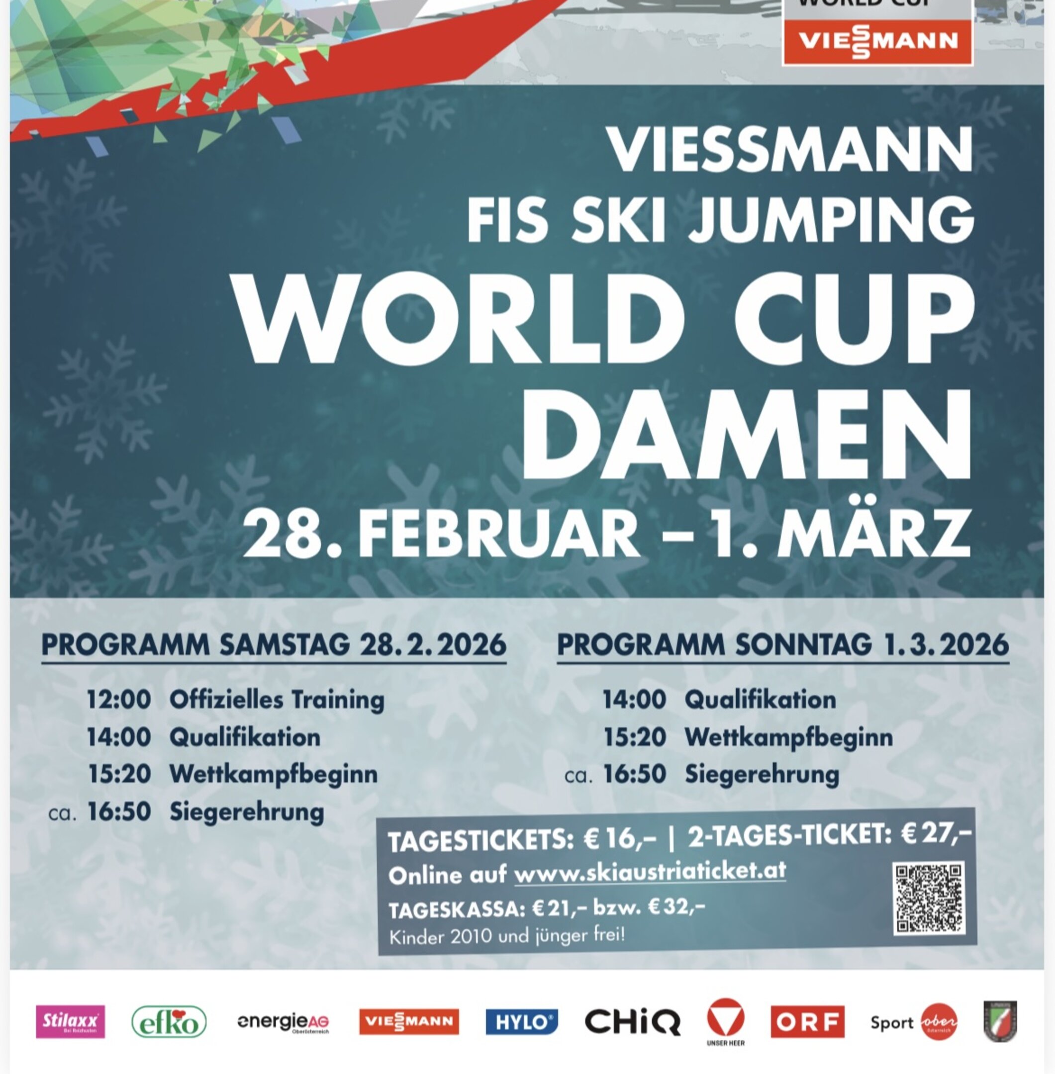 Wer die Weltelite der Skispringerinnen einmal live und wirklich hautnah erleben möchte, der hat dazu beim 13. Viessmann FIS Skisprung Weltcup der Damen an drei Tagen die Gelegenheit. Beim freien Training am Freitag, 27. Februar (14 bis 17 Uhr) kann bei freiem Eintritt ein erster Blick auf Abigail Strait, Anna Odine Stroem, die Österreichische Nationalmannschaft und Co geworfen werden. Samstag, 28. Februar und Sonntag, 1. März wird jeweils ein Weltcup-Einzelspringen ausgetragen.